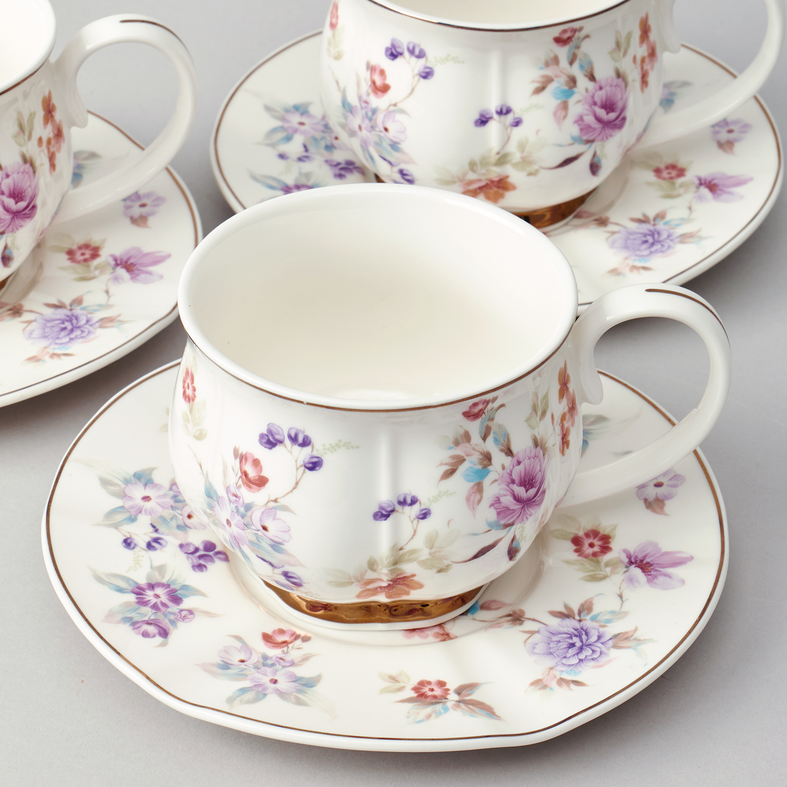 ТМ LEFARD коллекция выполнена из тонкостенного фарфора. Стильная форма, вместительный объем, модное сочетание пастельных тонов и цветочной деколи, отделка золотом - все это делает коллекцию неотразимой и очень привлекательной. Форма и цвет посуды способны оказать магическое действие на всех, кто находится за столом. Это прекрасный подарок. Продукция прошла сертификацию и безопасна для контакта с пищевыми продуктами. Можно ставить в микроволновую печь, не рекомендуется мыть в посудомоечной машине. Комплектность: 6 чашек 250 мл., 6 блюдец 15*7,5 см.